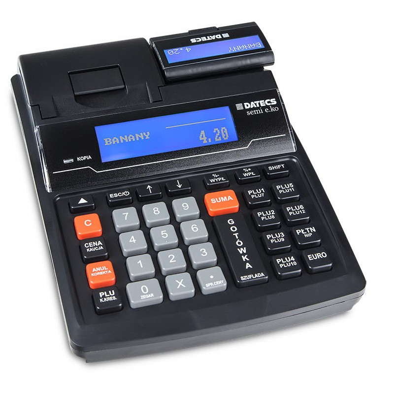 Kasa SEMI E.KO to kolejne urządzenie marki DATECS z kopią elektroniczną ale pierwsze z funkcją drukowania numeru NIP nabywcy na paragonie! Kasa wyposażona jest w system wymiany papieru typu „wrzuć i pracuj”. Dzięki niemu wymiana papieru jest bardzo prosta i nawet początkującemu użytkownikowi zajmie tylko chwilę. Zastosowana rolka papieru o szerokości 57 mm umożliwia drukowanie 30 znakowych nazw towarów PLU a jej 40 m długość sprawia, że odstępy między wymianami rolek są dłuższe. Ergonomiczna obudowa, trwały i wydajny akumulator, duża baza towarowa, możliwość komunikacji z wieloma urządzeniami zewnętrznymi oraz funkcja automatycznego kończenia paragonu sprawiają, że doskonale nadaje się do pracy w małych i średnich placówkach handlowych (np. Kiosk, Warzywniak, Cukiernia itp. ) i usługowych (np. Salon fryzjerski), gabinetach lekarskich, kancelariach adwokackich a także w kasach biletowych i szkołach nauki jazdy.